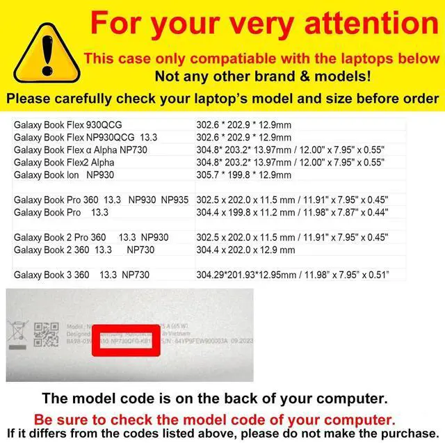 Only for below laptop model: 13.3" Samsung Galaxy Book Flex Alpha NP 73013.3" Samsung Galaxy Book lon NP 93013.3" Samsung Galaxy Chromebook 13 XE930QCA / XE930QCA-K01US / XE930QCA-K02US 13.3" Samsung Galaxy Book Pro 13.3 NP930XDB-KD1US NP930XDB-KD2US 13.3" Samsung Galaxy Book Pro 360 13.3 NP930QDB NP930 NP 93513.3" Samsung Galaxy Book Flex 13.3 NP930QCG / NP930QCG-K01US 13.3" Samsung Galaxy Book2 Pro 360 13 NP930QED XE930QCA-K01US XE930QCA-K02US 13.3" Samsung Galaxy Book2 Pro 13 NP930XED NP930XED-KA1US NP930XED-KF2US NP930XED-KF1US 13.3" Samsung Galaxy Book2 360 13 NP730QED NP730QED-KB1US NP730QED-KB2US Laptop 13.3" Samsung Galaxy Book3 360 13 NP730QFG-KA1US LaptopThis case features a minimalist business design made of synthetic leather and lined with soft microfiber, so you don't have to worry about any damage. The case design allows you to easily open and close the laptop and provides easy access to all ports.