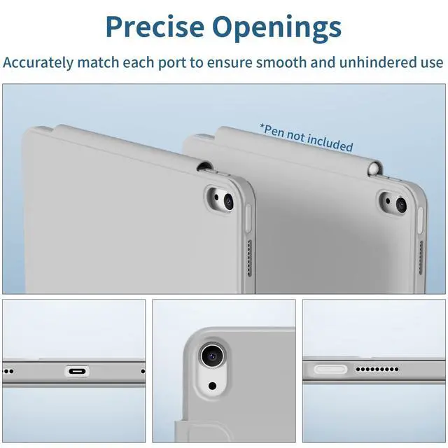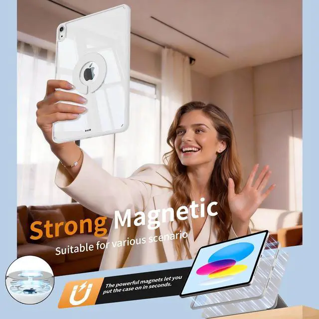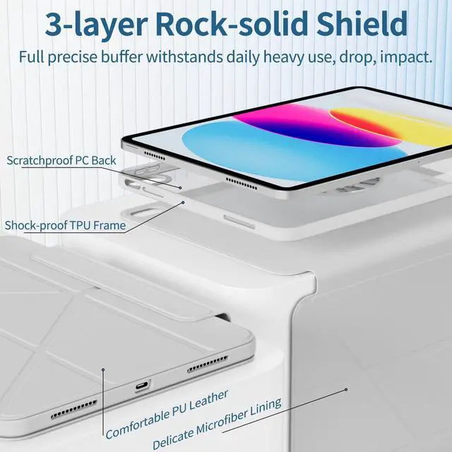 (Note: Pencil is not included in the package) ^^ MAGENETIC CLEAR HARD PC BACK SHELLThe back shell of the Clear iPad 10th Generation Case is made of transparent hard PC material, which provides excellent protection and can perfectly display the original appearance of your 10.9 inch iPad. (Please tear off the protective film on both sides of the clear case before use). The round magnet can be attached to the protective case or any other object with a magnet. ^^ HIGH QUALITY MATERIALS & PRECISE CUTOUTSThe outside of the cover is made of high quality PU leather and flexible soft tpu, the inside is made of soft microfiber lining, which can effectively prevent screen scratches. It is precision machined to accurately match all keys and openings. So you can easily access all the controls and functions, such as touch ID, camera, speakers, ports and buttons. ^^ STABLE TRIFOLD STAND & Y STANDThis A3356 Smart Magnetic Case can be adjusted to a stable trifold stand, you can watch videos at a 65 angle and type at a 30 angle. It also can be adjusted to a Y-shaped stand that provides a higher usage angle, so it can be used in a variety of scenarios.