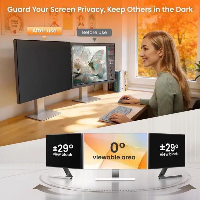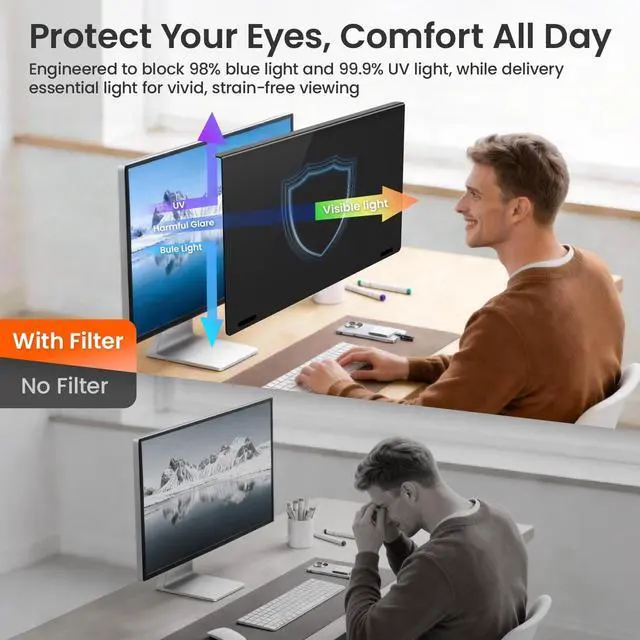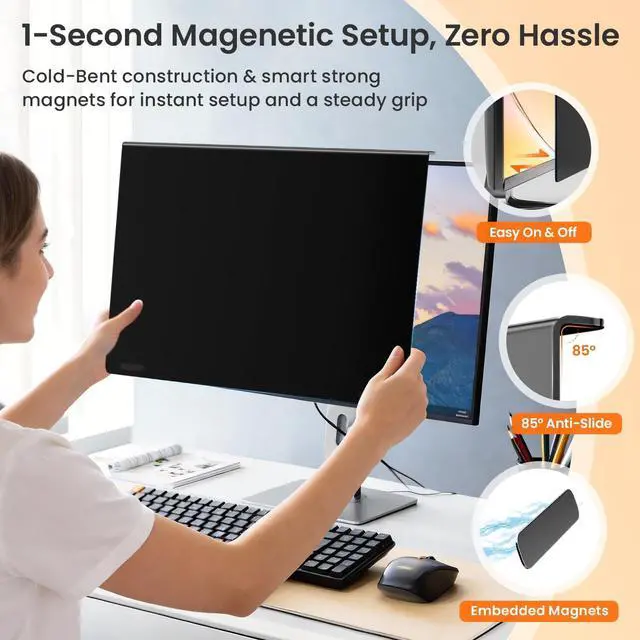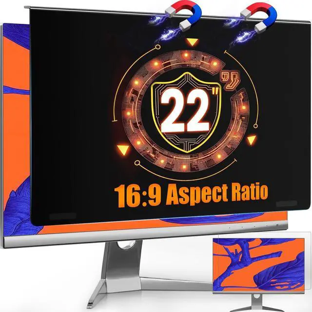 Note: Does not include bezel. Not for curved monitors ^^ Guard Against Side PeekingUsing advanced micro-louver technology, this 22 inch privacy screen for monitor clearly blocks views starting at 29side looks get darker until the screen turns completely black near 60. Anyone trying to peek from beside you sees only a dark screen, while you enjoy full brightness and clarity straight on. Keep sensitive data confidential in open offices, bank counters, libraries, or any digital workspace. ^^ Easy Snap-On Magnetic InstallationNo tools or complicated steps needed. The unique one-piece cold-bent frame with 4th-Gen built-in magnets allows you to attach the computer screen privacy shield instantlyjust align and it snaps securely in place. Remove it just as easily without leaving residue or marks. The 85 anti-slip bracket design helps keep it firmly positioned during daily use. ^^ Eye Protection for Long Screen UseThis privacy screen for computer monitor significantly reduces eye strain and minimizes potential vision fatigue. It filters 99.9 % of UV rays and blocks 98% of blue lightcommon causes of discomfort during long screen use. The matte surface effectively cuts glare and minimizes distracting reflections, helping you maintain focus and visual comfort in various lighting conditions.