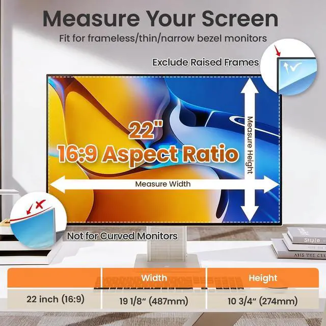 Fits 22-inch Computer MonitorsThe JEEETINTX 22 inch Privacy Screen Filter ( 16:9 aspect ratio) is designed for frameless or thin/narrow bezel monitors with a 22-inch size. The screen dimensions are 19 1/8" in width and 10 3/4" in height (487274 mm). Please measure your screen's viewable width and height before ordering.