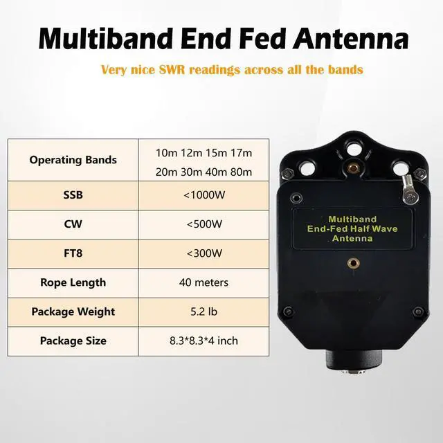 Wide Frequency Range: With support for multiple bands (10m 12m 15m 17m 20m 30m 40m 80m), the half wave antenna provides exceptional performance across different frequencies, providing unparalleled flexibility for a wide range of radio applications ^^ High Power Handling, No Tuning RequiredThis professional end fed antenna is a high-power HF antenna built to withstand demanding operating modes: