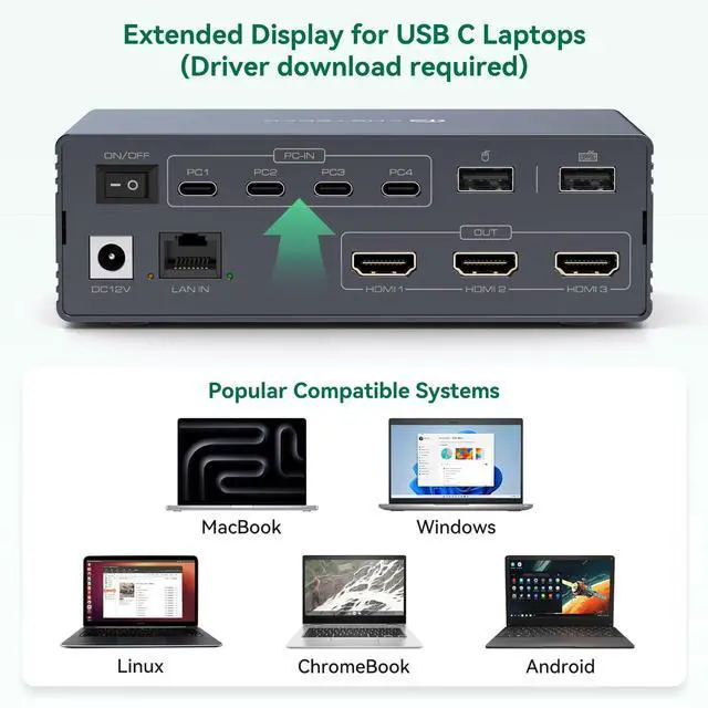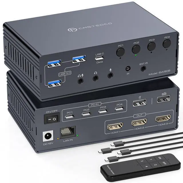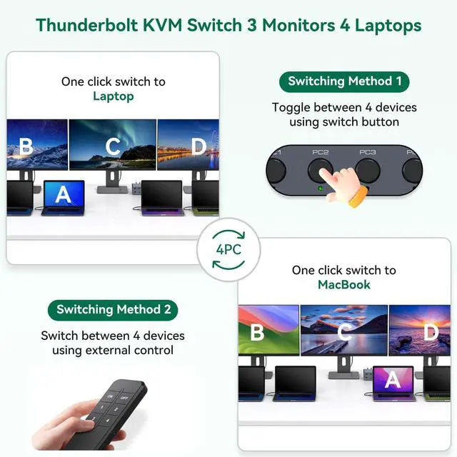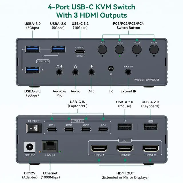 Simplify Your Setup: Connect your laptop with just four USB-A/C to C cables and say goodbye to cable clutter. Create a cleaner, more organized workspace that keeps you focused and productive. Switch effortlessly between four laptops using the front-panel buttons or an external controller. The front panel also features dedicated 3.5 mm audio and microphone jacks for versatile audio connectivity. ^^ Multi-Function Connectivity and