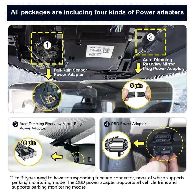 G-Sensor detects a sudden collision and immediately save & lock current video to specified folder, prevents relevant footage from overwriting. ^^ What you getMangoal OEM Look 4K Dashcam x1, Rear Cam x1, Rear Cam Cable x1, 128G MircoSD Card x1, User Manual x1, OBD Adapter x1, Rain Fall Sensor Adapter x1, Auto-Dimming PlugAdapter Cable 16 pin x1, Auto-Dimming PlugAdapter Cable 5 pin x1, Crowbar x1, Strap x2, worry-free 12-month warranty, and friendly customer service.