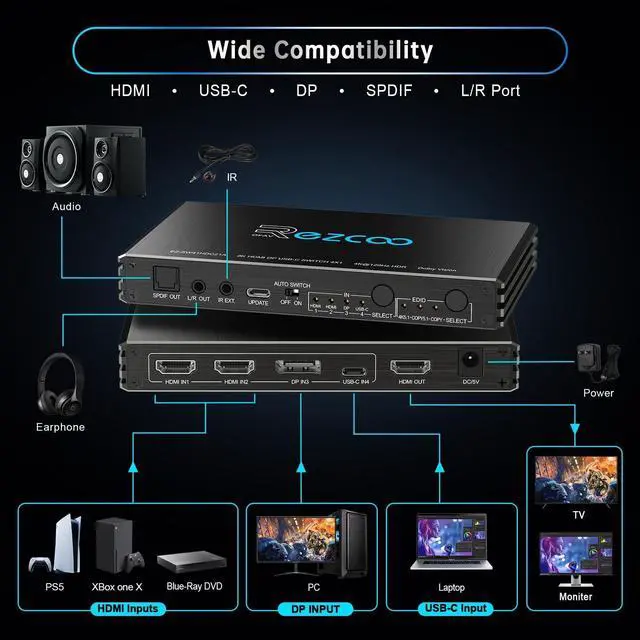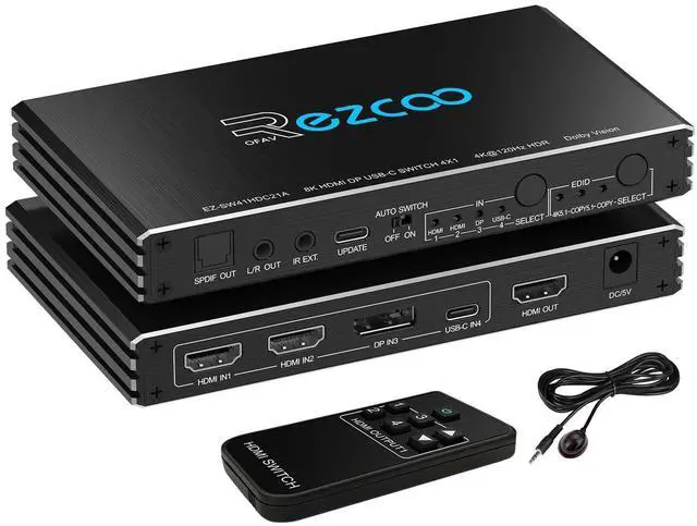 8K HDMI 2.1 Switch 4x1 with USB C DP 1.4 INPUTThis switch allows you to easily switch between 2 HDMI Sources and 1 USB-C& 1 DP 1.4 input Source with Audio Extractor through Optical SPDIF or L/R Out and output to one HDMI Display. ^^ True 8K Ultra HD VRR ALLM Video & Audio FormatVideo Format - Supports resolution up to 8K@60Hz, 4K@120Hz, 3D, HDR, HDCP 2.2, HDCP 2.3 bypass, IMAX DIGITAL(2K/4K), 4:4: 4 8bit - Audio Format - HDMI Audio Extractor Converter DE-embed SPDIF Optical Digital ( 5.1CH ) + 3.5 mm L/R Stereo Audio ( 2.1CH ), Digital 7.1CH, DTS: X, DTS-HD Master Audio. Soundbar supported. ^^ 8K Switcher Selector Easy Usage -- Plug and play. Power on with adapter. Simply connect HDMI sources to Input ports and HDMI display device to Output port through HDMI 2.1 cable. Then connect audio device through Optical Toslink SPDIF 5.1C h port or AUX L/R 3.5 mm 2.1C h port. The led light will indicate which port is working. Easily switch between 4sources by pressing the panel button. ^^ High Compatibility -- 4 ports HDMI Switcher Selector is highly compatible with all operating system such as Windows, Mac OS, Linux. Also works perfectly with Logitech Harmony, Xbox one X, PS4 Pro, 4K, Roku 4, Fire TV, Blu-ray players, Projector etc. ^^ Please Note -- Highly recommend certified HDMI 2.1 cable less than 10ft / 3m. Please see ASIN B0BB78BFNJ if needed.
