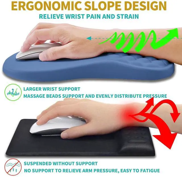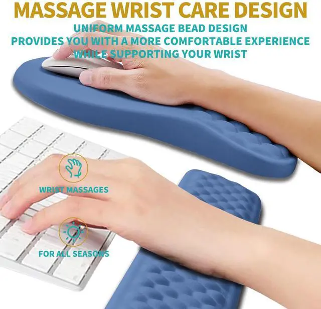 2 In 1 SetThe set includes an ergonomic mouse pad wrist support(12x8x 1.2 inch, 300x200x30mm) and a wrist rest for computer keyboard(17x 3.1 x 0.8 inch, 430x80x20mm). The massage bead design, filled with memory gel, can effectively improve carpal tunnel pain caused by long-term use of keyboard and mouse. ^^ Ergonomic Massage DesignThe innovative ergonomic slope and massage bump design perfectly support the wrist and palm. Massage bump design can effectively relieve wrist pain and fatigue, improve carpal tunnel syndrome (CTS), strengthen the air circulation between wrist and mouse pad, prevent sweating, and keep your wrist in the most comfortable state.