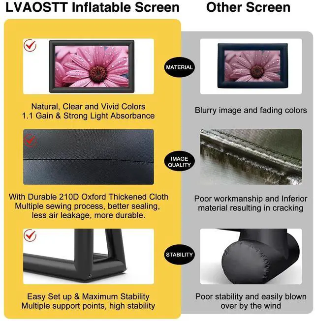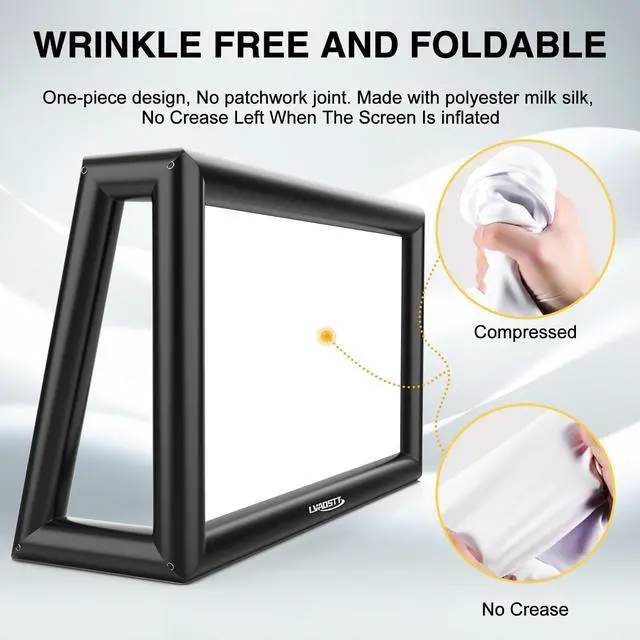 One-piece design, no need to install the screencloth. No patchwork joint, No creases! It's stable and without hassle of assembling, just connect the blower and inflate it! ^^ HIGH QUALITY MATERIAL & EASY TO CLEANThe inflatable movie screen is made with 210D oxford cloth and has a multiple sewing process. The white display screen is made of more delicate silk cloth. No creases are left when the screen is inflated. The black frame is made of tougher Oxford cloth, which is non-deformable and stain-resistant to ensure durability. And It is easy to clean with a cloth.