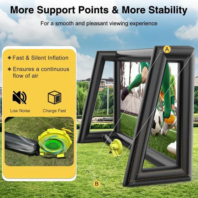 ^^ EASY TO SET UP AND CARRYSet up your movie night in minutes! The included powerful air blower inflates the screen in just 24 minutes with minimal noise (dont forget to ZIP UP the zipper before inflating). When the shows over, simply deflate, fold, and pack it away in the included portable bag for easy storage and transport. ^^ ENJOY LEISURE TIME WITH PROJECTOR SCREENKick back and enjoy movie nights under the stars with family and friends right in your own backyard! Whether its a birthday bash, a sports game, or just a casual hangout, this big screen setup is perfect for turning any gathering into a special event.