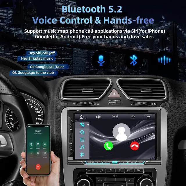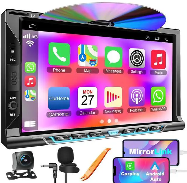 Voice Control CarPlay & Android AutoThis 7-inch double din car stereo is compatible with CarPlay and Android Auto. You just need to connect your phone with a USB cable that makes it possible for you to access GPS navigation, answer phone calls/messages, play music and FM/AM radio, etc on this double din car stereo with Bluetooth. You can also able to wake up the voice assistant Siri or Goo-gle Assistant to operate Apps on your phone while keeping your hands free for safe driving! ^^ Media PlaybackWatch your choice of videos through the DVD player, play music through your Bluetooth device, pop in a CD or use the USB and SD ports for more audio alternatives.