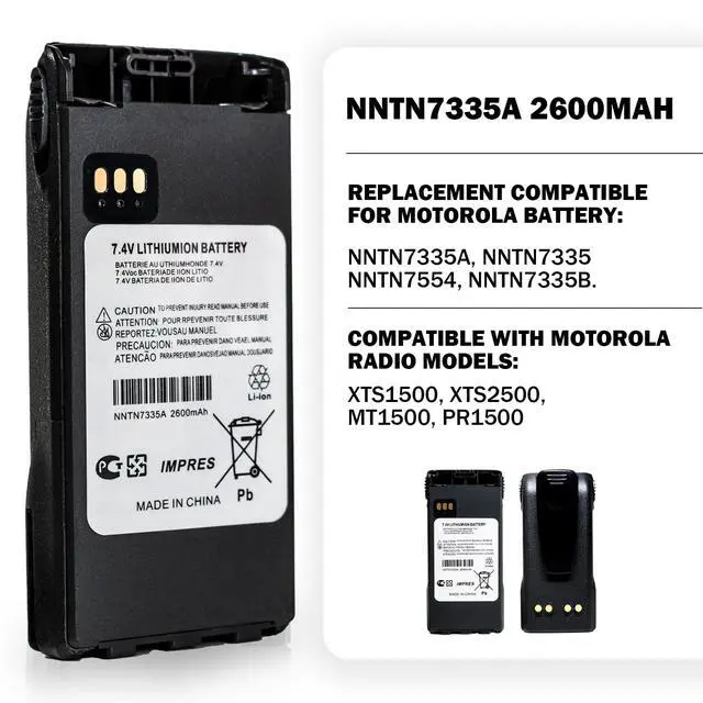 NNTN7335A NNTN7335 2600mAh 7.4V Li-ion Replacement Two-Way Radio Battery for Motorola NNTN7554 NNTN7335B Talkabout Radios ^^ Two-Way Radio Battery Compatible with Motorola Ham Hand Held Radio Models: XTS1500, XTS2500, MT1500, PR1500 Walkie Talkie replacement original batteries ^^