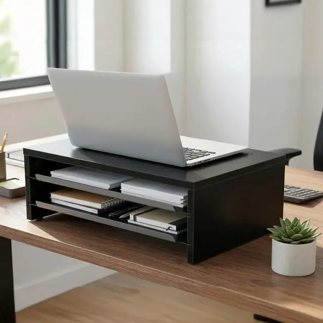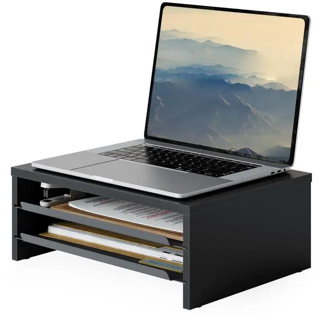 3 Tier Desk Stand Equipped with two sliding metal trays, Fenge monitor stand for desk allows instant access to USB drives, notebooks, and other small items. It helps free up to 30% of your desk space, transforming your workspace into a clean, minimalist zone in seconds. ^^ Ergonomic DesignRaises your screen by 5.3 inches, guiding your sight to a natural 15 downward tilt. This monitor riser promotes a proper 90 alignment between your neck and back, reducing slouching and neck strainideal for long hours of work or online classes.