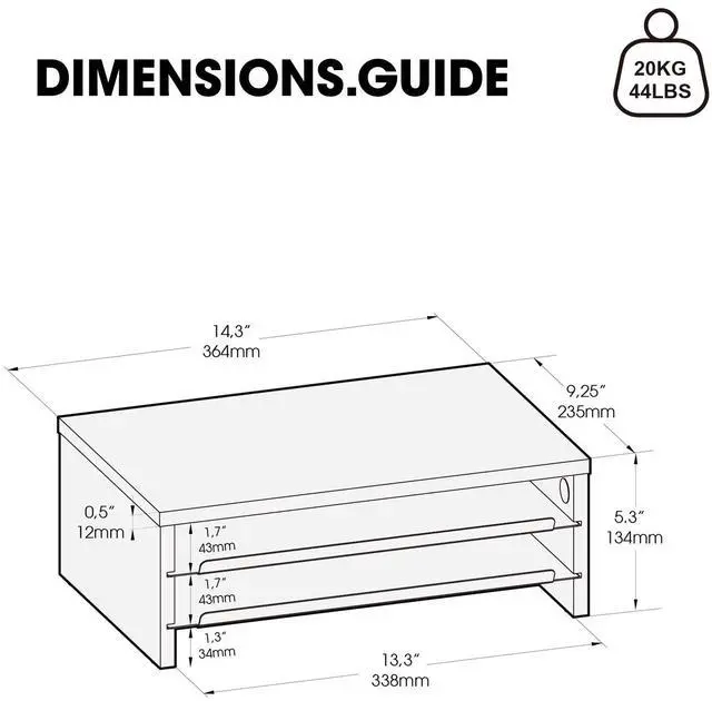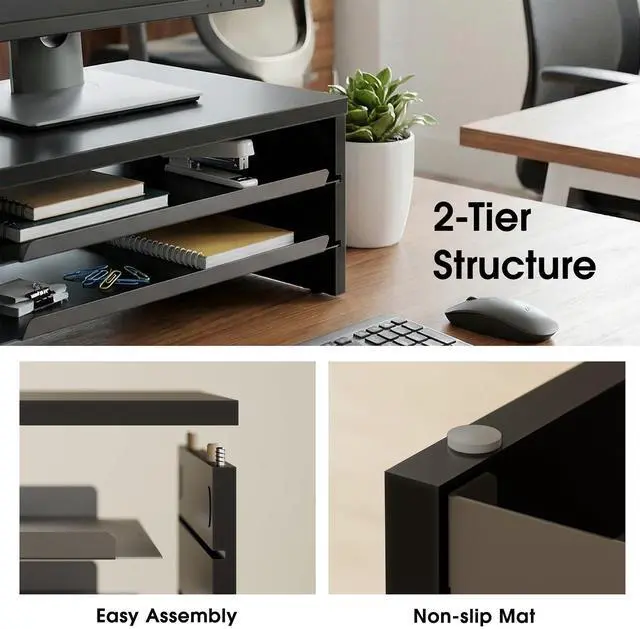 ^^ Sturdy & Slip-Resistant Crafted from premium MDF panels and rust-resistant metal shelves, this computer stand ensures stable typing without wobbling. Reinforced corners with silicone pads protect your desk from scratches. Tested to hold up to 44 lbs/20 kg, it remains durable and warp-resistant over time. ^^ Versatile Desk ShelfFeaturing 14.3 -inch wide, this desk riser functions as a laptop stand, printer stand, and desktop organizer. It adapts to various scenarios like office work and study, easily organizing your desktop devices. ^^ 3 Step Quick AssemblyWith pre-drilled holes, setup