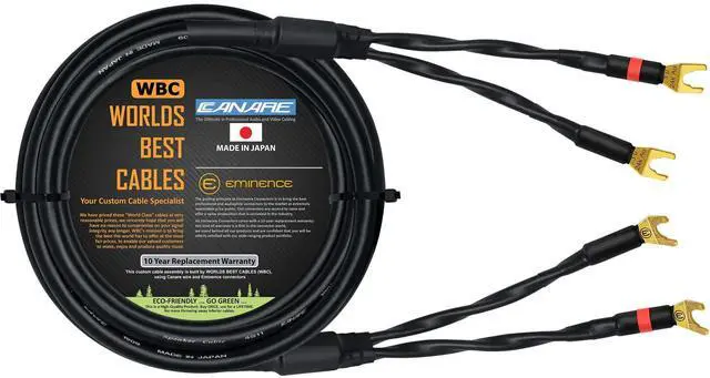Custom Made - 8 Foot - Canare 4S11 - Audiophile Grade - HiFi Star-Quad Single Speaker Cable for Center Channel, terminated with Eminence 24k Gold dual-plated, 3-micron, low-profile audiophile Eminence E900 multi-spade connectors (2x Spade to 2x Spade). The cable consists of four (4), 14 AWG conductors (11 AWG when paired as in this cable assembly). Please refer to detailed images in this listing for cable information and further details on the connectors. We at WBC always make world-class custom-built cable assemblies using many of the leading cable and connector brands, if you are unable to find the length and type of cable you are looking for, please feel free to contact us, we will strive to assemble the required cable for you.