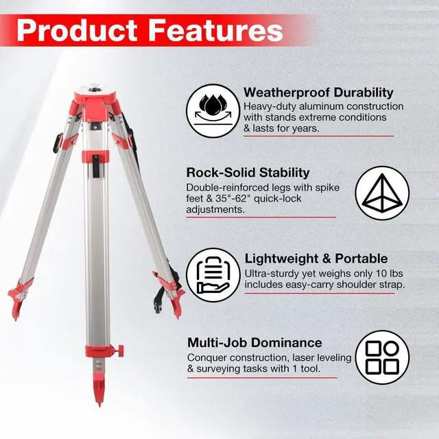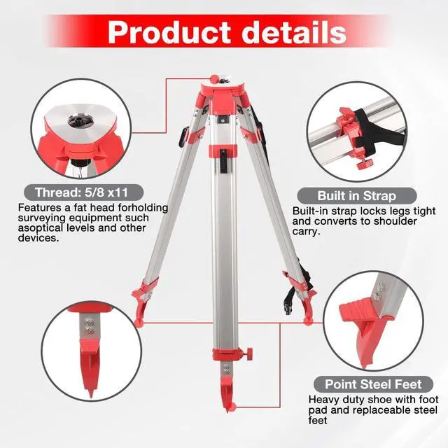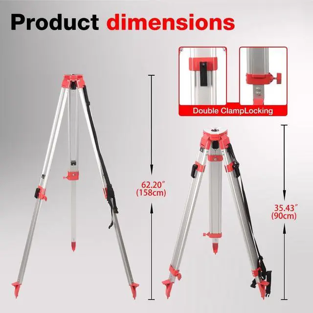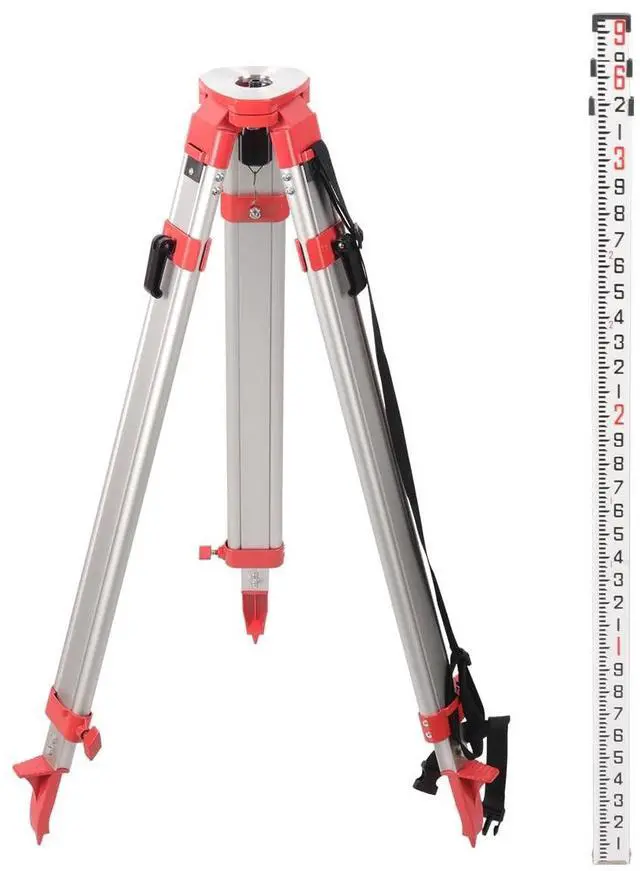 9ft Telescoping Aluminum Grade RodPrecision-engineered with 3-section telescopic aluminum construction, this grade rod extends to 9ft (3m) and collapses for compact storage. Features dual-sided graduations for versatile measurement. The durable anodized finish ensures longevity in harsh job site conditions ^^ 65" Heavy-Duty Adjustable TripodBuilt with robust aluminum legs and a quick-clamp locking system, this survey tripod adjusts from 39" to 65" for optimal stability. Equipped with a 5/8"-11 threaded flat head, it securely holds rotary lasers, theodolites, and optical levels. Double-banded legs and spiked metallic feet ensure grip on uneven terrain ^^ Dual-Scale Precision & Lightweight PortabilityAchieve accurate measurements with clear, corrosion-resistant dual-scale markings on the grade rod.