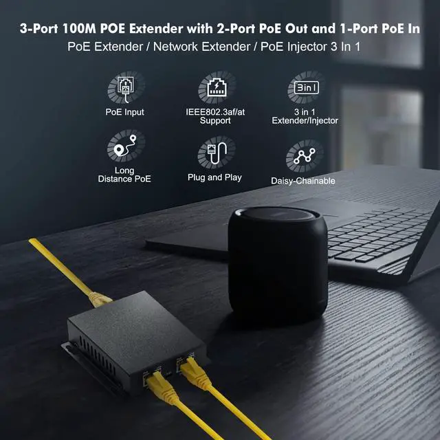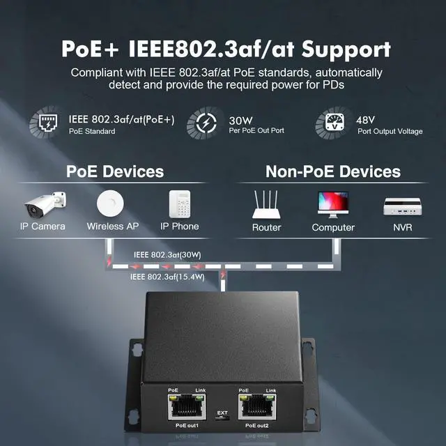 PoE PassthroughInclude 1 PoE In 2 PoE Out Ports, 10/100Mbps rate self-adaption. Powered by PoE network, no AC power supply required.