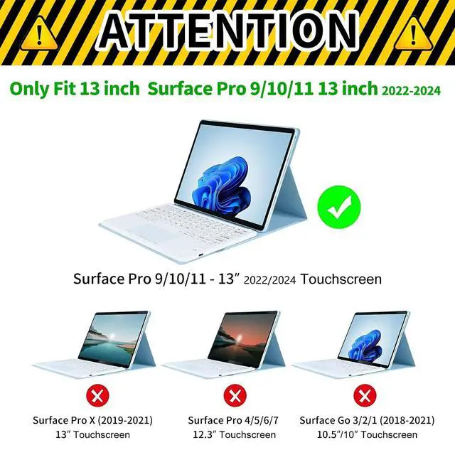Only CompatibilityThis case is compatible with Microsoft Surface Pro 11 (2024 release) 13 inch, Surface Pro 10 (2024 release) 13 inch, Surface Pro 9 (2022 release) 13 inch, Please check back of your tablet to find the model number ^^ Auto Wake/SleepAutomatically wakes or puts tablet to sleep when the lid is opened and closed, wakes the tablet case up, saving power for longer reading time. ^^ Stable Stand DesignAdjustable stand offers a 60vedios viewing position and a 30typing position, satisfying your needs on your tablet. Free your hands for other entertainments.