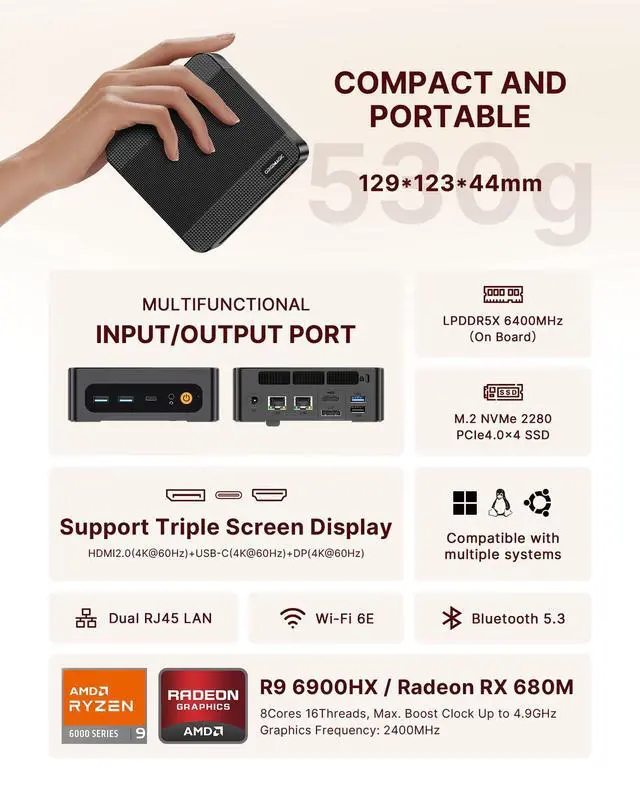 Ryzen 9 6900HX Mini PCExperience unprecedented performance in our 6900HX mini pc featuring the AMD Ryzen 9 6900HX processor and Radeon 680M graphics. This powerful mini gaming pc delivers 8 cores, 16 threads, and 4.9GH z boost speeds, making it perfect for gaming, 3D rendering, and streaming. ^^ 32GB LPDDR5X RAM & 1TB PCIe 4.0 SSD + ExpansionOur mini computers have 32GB LPDDR5X 6400MHz memory and 1TB PCIe 4.0 NVMe SSD. With an additional M. 2 slot for storage expansion, it delivers a powerful Internet experience for seamless browsing, streaming, and gaming.