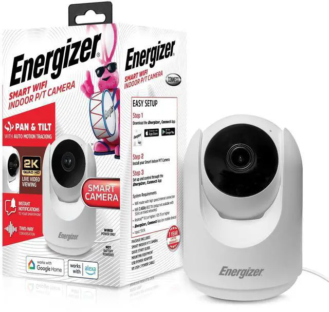 The Energizer Smart 2K Indoor Pan & Tilt Wired Camera offers a powerful blend of advanced technology and convenience, perfect for keeping a close eye on your home. With a 355-degree horizontal and 48-degree vertical pan and tilt range, this camera provides extensive coverage, allowing you to monitor every corner of a room. Whether youre checking in on pets, children, or valuable belongings, the cameras 2K video resolution ensures crystal-clear images, capturing every detail with precision. Equipped with motion tracking, the camera automatically follows movement within its field of view, so you never miss a moment.