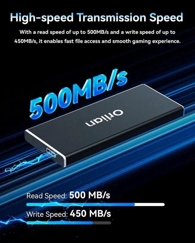 High-speed transmission speed: Equipped with a solid-state drive that supports the USB 3.1 Gen 2 standard, the read speed can reach up to 500MB per second, and the write speed can reach up to 450MB per second, the performance of solid-state drives is much faster.. This enables fast file access and a smooth gaming experience, thereby providing a more efficient and enjoyable usage experience.
