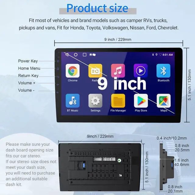 Plug & Play Compatibility: Works with Honda, Toyota, Ford, Chevy, Nissan, RVs, Trucks, and more. Fits 99% of double din dashboards. ^^ 9" HD Touchscreen ^^ Ultra-Clear GPS Navigation & Backup