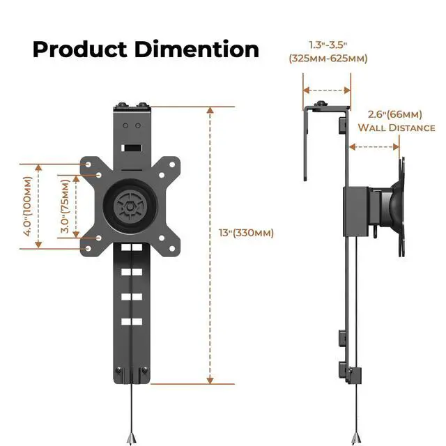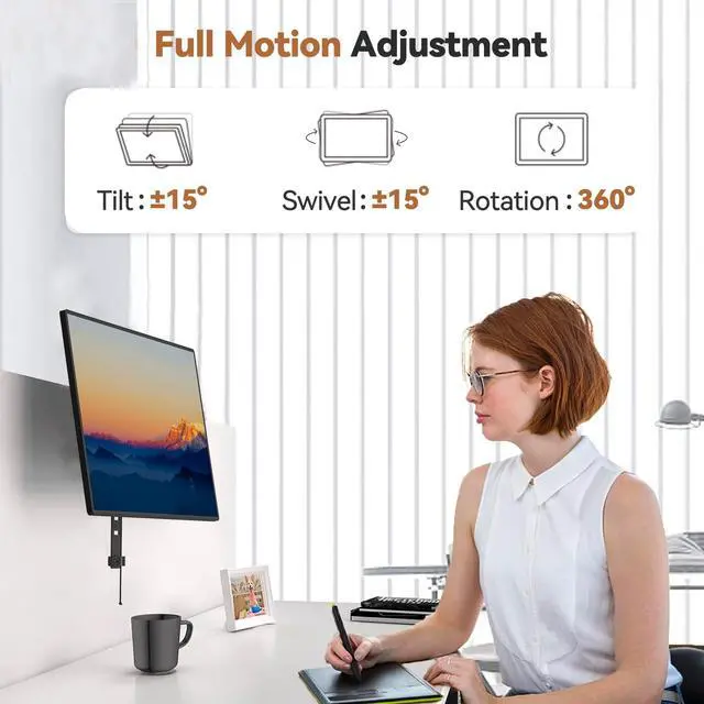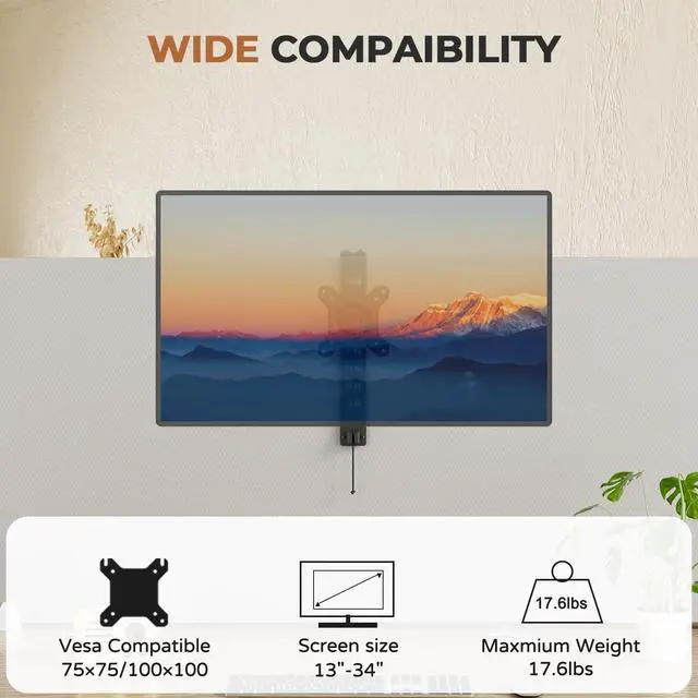 Wide Compatibility- This Office Cubicle Monitor Bracket fits universal screens that 13 to 34 in size and max 17.6 lbs in weight. The VESA mount can mount most monitors with 75*75/100*100 mm VESA plate ^^ Angle & Height Adjustment- The Cubicle Monitor Mount offers 360 rotation, 15tilt, 15swivel, and 8-gears height adjustment from 2.3" to 10.6" by adjusting the VESA mount or pulling down the rope. Portrait and landscape screen positions are acceptable ^^ No Drilling Required - The monitor hanger attachment fits perfectly for mounting on bezels up to 3.5"" thick and can be installed without drilling holes, protecting the wall.