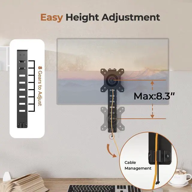 The VESA plate is detachable to help you install the monitor quickly ^^ Cable Management- The cubicle monitor hanger is designed with cable management, allowing you to organize cables neatly. Then you can free up more space and keep your desk neat and tidy ^^ Sturdy Construction- Our vesa monitor stand is made of cold rolled steel with a rust resistant coating that increases the natural lifespan of the stand. The ergonomic design makes the structure of the bracket more stable