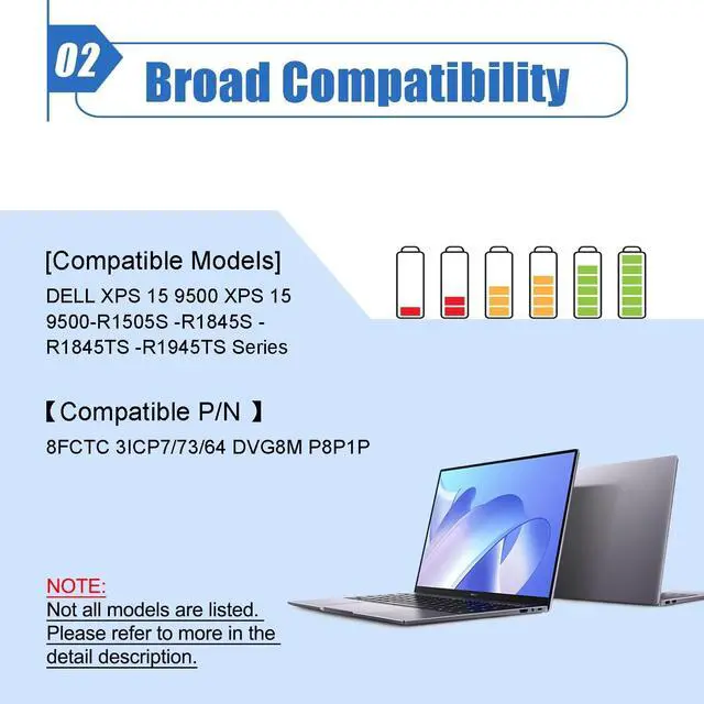 Note: return windows will close after one month, dont worry about it, you can click on seller store on right corner ask a question and contact seller directly. ^^ Compatible Battery P/N 69KF2 8FCTC 08FCTC 070N2F 70N2F M59JH 0M59JH P8P1P 0P8P1P DVG8M 0DVG8M. ^^ Compatible Laptop ModelsReplacement for DELL XPS 15 9500 XPS 15 9500-R1505S -R1845S -R1845TS -R1945TS Series Notebook. ^^ Note We strongly recommend you to check and confirm your laptop model, original battery model and appearance before placing your order, compare it with our battery images to make sure it is the one you need. If the new battery is not recognized during the initial installation, please reinstall and check if the interface is fully connected.