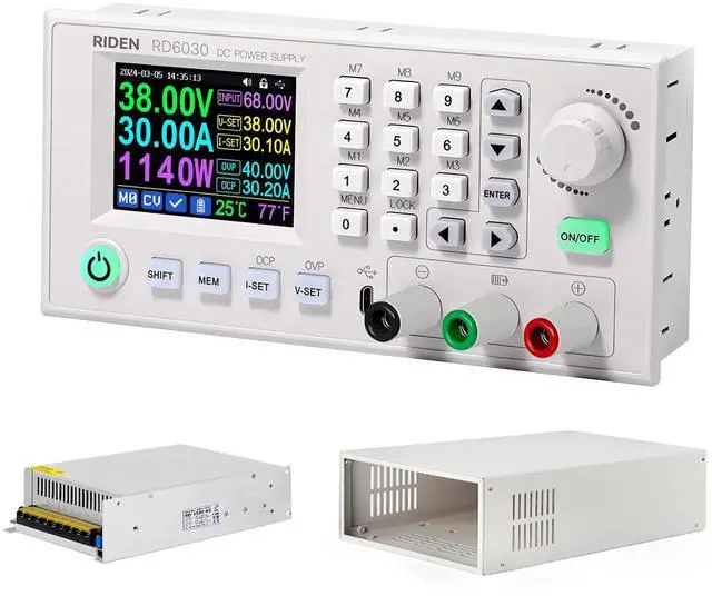 RD6030W supports PC software by connecting with USB micro cable, support RUIDENG tech APP too. ^^ Support 60V 30A 1140W max output, you can use big current to charge battery, but notice that you need to use the green battery charging terminal as output+ ^^ default 110V AC input on the RD-1500-68 PSU, it can let RD6030W output 60V 30A separately, but no full output due to the input voltage limit, RD6030W can only output 1140W max ^^ you can assemble this 3 parts as a whole set, but you need to prepare a AC power cable so that you can connect the device to the outlet on the wall, and the PSU are default 110V AC input, if you use 220V AC, please change the input gear ^^ There is a backup fuse in the box, you do not need it now, only if you burn the fuse, you can replace the burnt fuse ^^ User Friendly interface, keypad control, DIY display style, PC software, for more function, please check the instruction