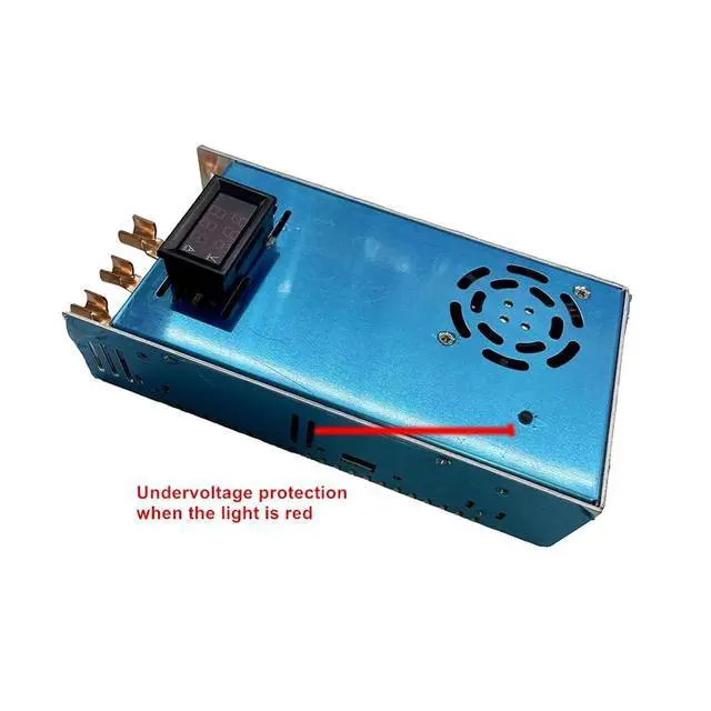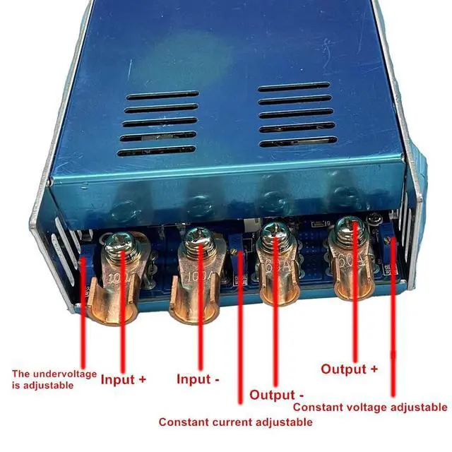 Input voltage: DC12V-60V, do not use less than 12V input voltage, full load output greater than 60V, when the input and output voltage difference is large, should be appropriate to reduce the output power. The greater the voltage difference, the lower the efficiency of the power supply and the greater the heat output. Maximum input current shall not exceed 100A, power shall not exceed 2000Woutput voltage: DC15V-80V, maximum output current shall not exceed 50A, power shall not exceed 1850WUndervoltage adjustable range: DC 10.5V -50V(decrease clockwise, increase counterclockwise), first adjust the undervoltage to the minimum, then adjust the input voltage to the required undervoltage protection value, and then slowly increase the adjustable value counterclockwise, when the undervoltage indicator lights up, turn it back one or two turns, and then reconnect the power supplyThe power supply is equipped with intelligent temperature-controlled fans. When the temperature of the power supply reaches 55-60 degrees Celsius, the fan will automatically turn on. When the temperature of the power supply drops to 50 degrees Celsius, the fan will automatically turn off. When the output of the module requires constant current limiting, the input and output ground cables must be connected separately and cannot share the same cable. When using switching power supplies or other secondary power supplies, ensure that the power supply should be greater than twice the power of the module. The output blue indicator lights up only when the power supply is increasing. When the power supply has overcurrent or undervoltage protection, the output still has a voltage close to the input value, and the protection is only that the power supply does not boost the voltage.