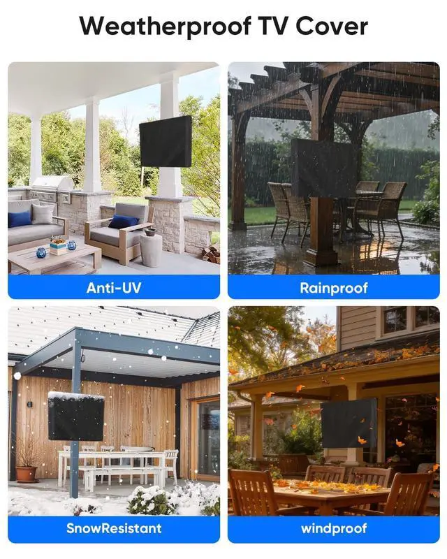 Outdoor Cover: Full cover with bottom sealed / Zipper / hook-and-loop straps. Ensure the strong firm stick of the outdoor TV cover.. Give your television a perfect full protection. Waterproof material provide 360 degrees protection for your outdoor TV