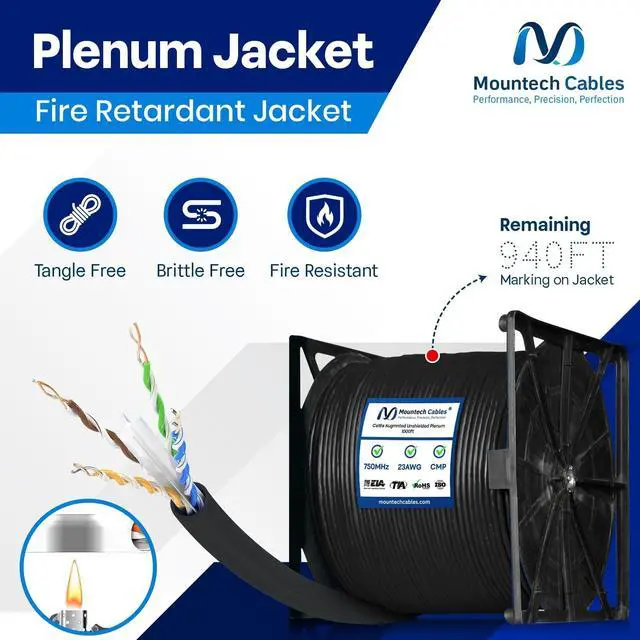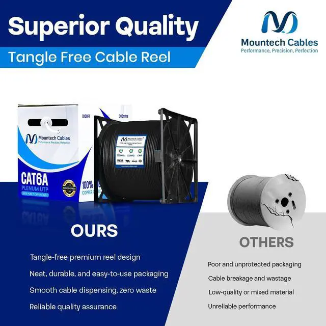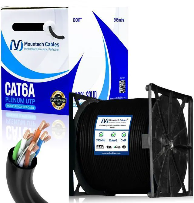 - This Cat6a plenum 1000ft ethernet cable delivers blazing-fast speeds up to 10 Gigabit with 750MHz bandwidth, ensuring smooth data transfer, gaming, and streaming without lag. ^^ % Built with pure solid copper (23AWG) for superior conductivity, minimal signal loss, and long-lasting durability. This Cat6a unshielded 1000ft plenum cable guarantees reliable and consistent performance. ^^ - Flame-retardant plenum (CMP) jacket with low-smoke and low-toxicity design. Safe for use in plenum air spaces above ceilings or below raised floors in both residential and commercial installations. ^^? -- Comes with a tangle-free reel-in-a-box design for hassle-free pulls, accurate length tracking, and mess-free setup.