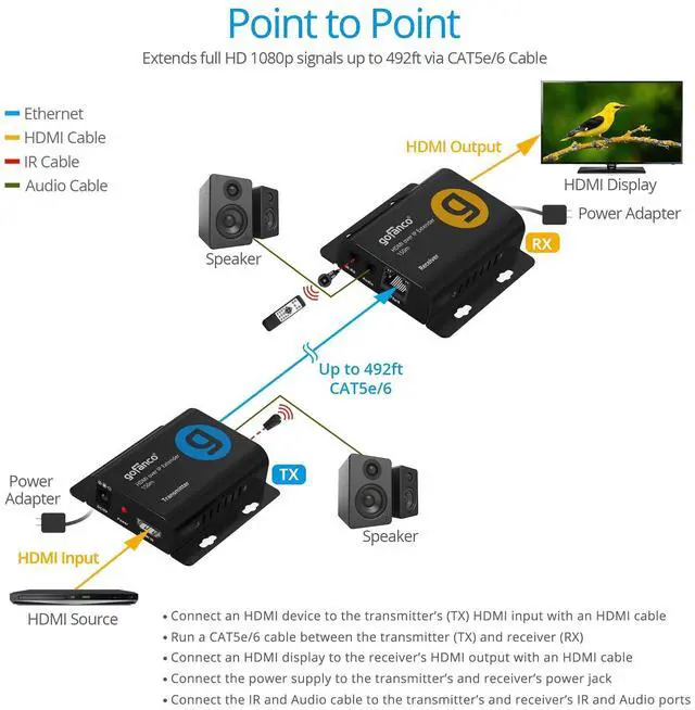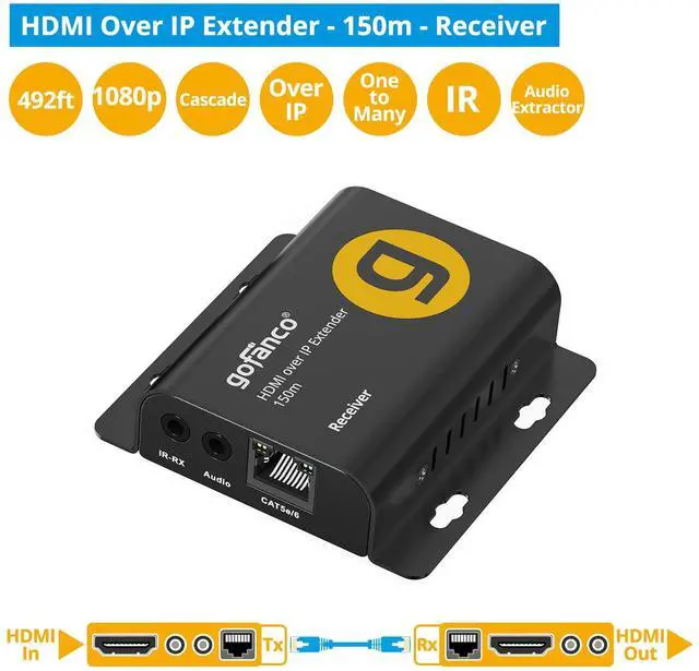 Seamless Long-Distance HDMI Streaming Over IP - Receives Full HD 1080p signals up to 492 feet (150 meters) over cat5e/6 network cables. Perfect for digital signage, remote workstations, or multi-screen setups; Delivers crystal-clear video up to 1080p 60Hz, ensuring smooth and vivid visuals every time ^^ One-to-One or One-to-Many Flexibility - TCP/IP compliant - one transmitter can connect to up to 253 receivers for large display networks; Easily scale from a single display to multiple screens via unmanaged Gigabit network switches. Add extra receivers anytime (Part# EXHDIP-150RX sold separately) ^^ Audio Extraction - Transmits HDMI stereo audio and provides PCM 2CH audio extraction via 3.5 mm jack on TX & RX units ^^ IR Remote Control (2060KHz) - Easily control your source device remotely with built-in IR pass-through support ^^ SIMPLE INSTALLATION - No drivers required.