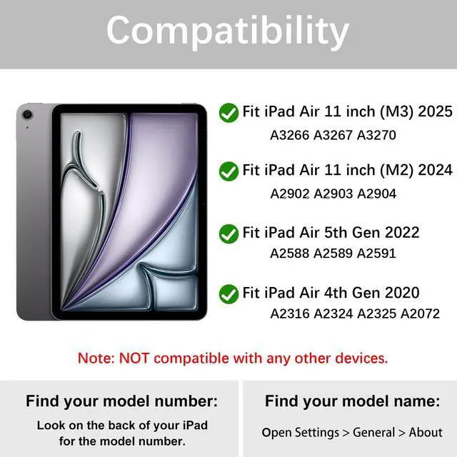 Gen 10.9" 2020(Fit models: A2316 A2324 A2325 A2072). NOT compatible with any other devices. NO pen in package. ^^ Support 3 System&Full Shortcut Keys- The magnetic wireless keyboard can be removed from the case freely. Compatible with iOS, Android, Windows. Just press Fn and corresponding keys (QWE) to change the keyboard system. Hot keys Customized for iPads, Full Shortcut Keys give you a more efficient way to use your keyboard. ^^ Long Life Battery&Rechargeable Slim Bluetooth Wireless Keyboard&Instant pairing- 2-3 hours full charge, work for more than 80 hours, stand by for 130 days. It even enters into sleep mode automatically if not in use for 15 minutes. Just Press any key to wake up. Mechanical scissors keyboard, quick rebound, press smoothly. ^^ Heat Dissipation&Super Non-slip- Honeycomb grid design on the back of the tablet case, prevent the iPad from overheating and extend its service life by more than 30%. The durable PU leather cover comes with a safety magnetic buckle to protect your iPad from all aspects, and non-slip rubber lining provide full protection for your tablet with strong anti-slip performance, providing more stable support for your iPad from multiple angles.