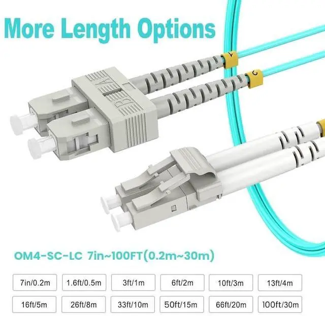 RamboCables OM4 SC-LC optic fiber patch cables help saving more space for your high density cabling in data centers, enterprise networks, telecom room and any places patch cables are needed. ^^ Transmission DistanceOM4 SC to LC fiber patch cables have a 4700 MHzkm @850nm bandwidth, allow for 10Gb Ethernet transmission distance of 400Meters at 850nm wavelength; 40Gb Ethernet transmission distance of 350Meters at 850nm wavelength; 100Gb Ethernet transmission distance of 125Meters at 850nm wavelength. ^^ Why to ChooseOM4 SC to LC multimode fiber optic patch cables are Constructed with LSZH environmentally friendly Jacket.