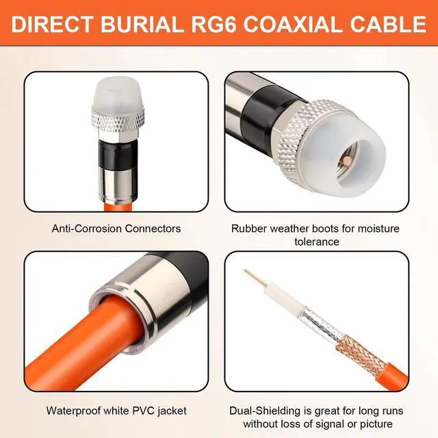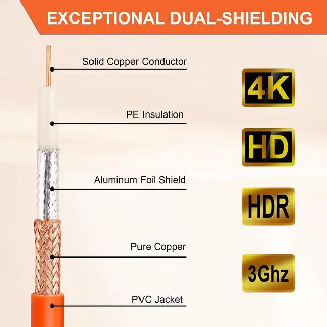 ^^ HIGH FREQUENCY RANGE - Our coaxial cable for tv is 100% pure copper core for high frequency range from 2.3MH z to 3.0GH z and corrosion resistant nickel-plated connectors minimize EMI & RFI interference. ^^ GREAT PICTURE QUALITY -- This rg6 tv cable use a 18 AWG center conductor, with exceptional dual-shielding - using 60% braid and 100% foil for maximum signal performance. It is great for long runs and can deliver a clear TV signal. The video quality was excellent and no jitter. ^^ CUSTOMER PROMISE -- Were committed to our customers absolute satisfaction.
