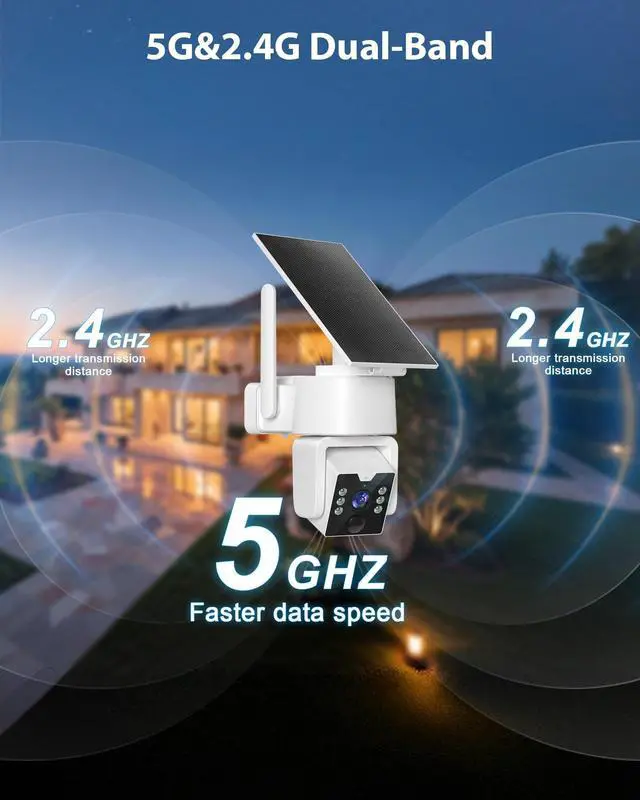 Camera: This essential outdoor wireless security camera boasts a 2304x1296p resolution, allowing you to see every detail clearly. Enjoy full-color night vision even in low-light conditions thanks to artificially triggered spotlight technology. ^^ Simultaneously supports 2.4GH z and 5GHz WiFi dual bands. The 2.4GH z band ensures corner coverage and strong wall penetration; the 5GHz band enables high-speed, short-range connections Automatically adapts to signal conditions, eliminating long-distance disconnections ^^