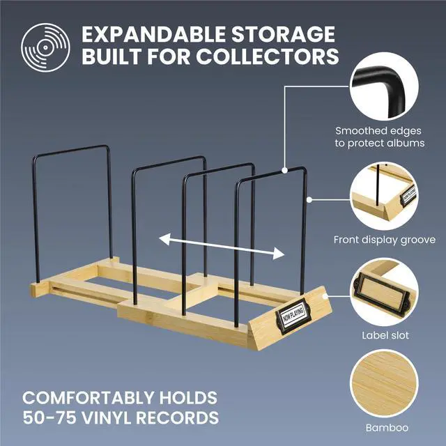 ^^ Classic And Durable: The bamboo base of this record storage unit offers durability and a timeless look. This vinyl record holder not only showcases your collection but also enhances your decor.