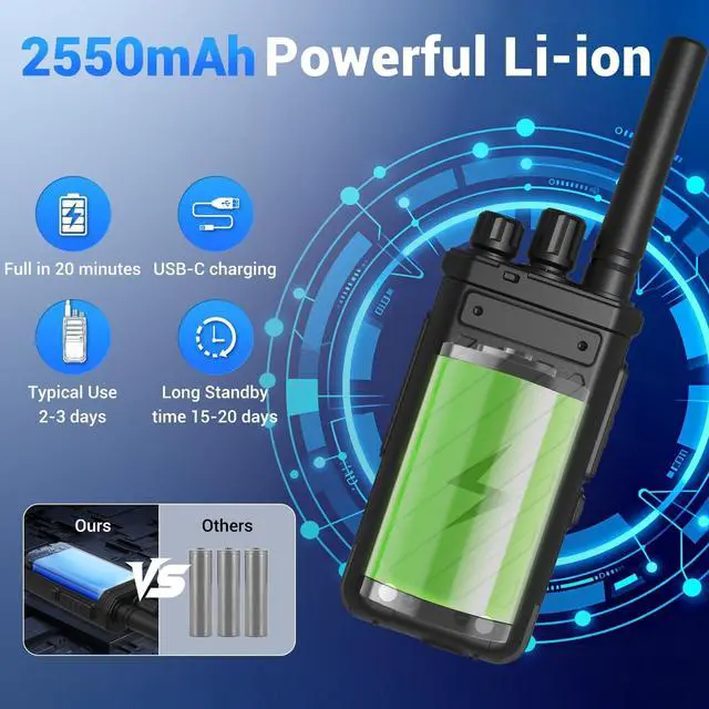 Way Radios: The body is made of durable and sturdy materials; can withstand shock and vibration in harsh environments; one meter free fall; the walkie-talkie has no damage and can continue to work normally; longer service life to save corporate communication costs. ^^ Long Battery Life; Adopting 2550 mAh large capacity Li-ion battery; It usually takes 3-4 hours to fully charge; provides up to 36 hours of usage time; allows you to stay in communication through out the day ^^ Wide Range and