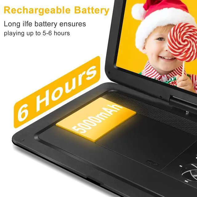 Long-Lasting 5000mAh BatteryUp to 6 Hours PlaybackEquipped with a 5000mAh rechargeable battery, this DVD player portable offers up to 6 hours of continuous playback. It also comes with a certified AC power adapter and car charger, ensuring you never run out of battery when you're on the go.