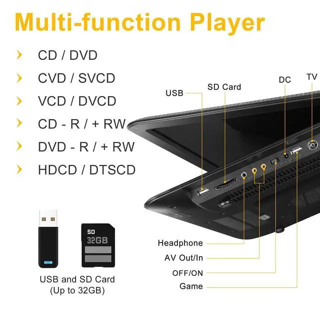 Region-Free & Multi-Format Support Play More ContentThis all-region portable DVD player with screen supports a wide range of disc formats, including DVD, CD, DVDR, CD-R(RW), SVCD, VCD, and more (does not support Blu-ray). It also supports multimedia files from USB and SD cards (up to 32GB), including VOB, AVI, MP3, WMA, and JPEG.