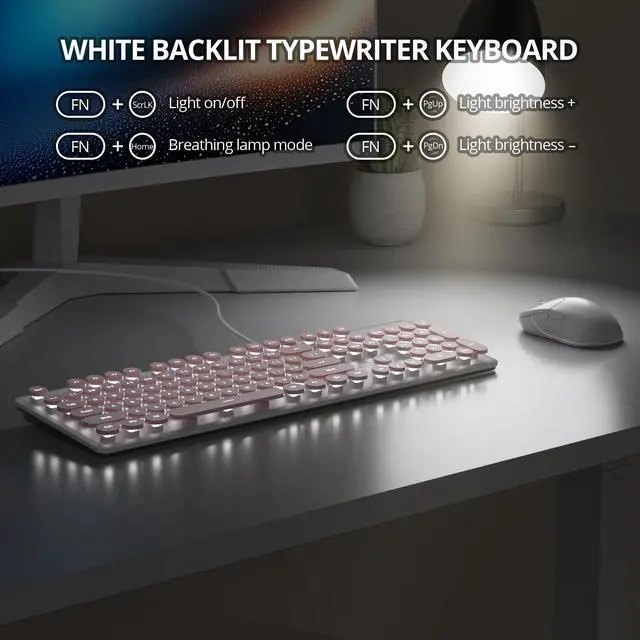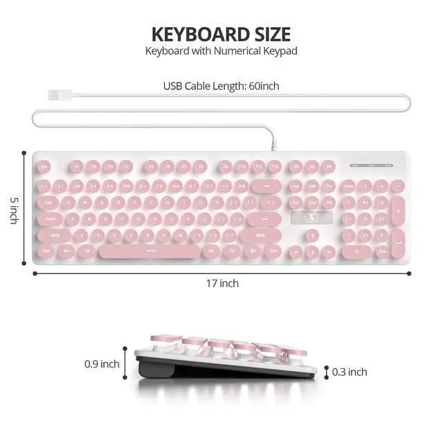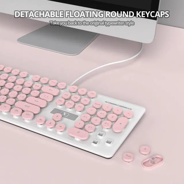 Mac OS (note: shortcut/multimedia keys may not work on Mac). Ideal for PC/laptop users, office work and daily use. ^^ Full-Size Layout & Ergonomic104-key US QWERTY layout with number pad every key right where you expect it! Ergonomic typing angle reduces fatigue, while non-slip base ensures stable use. Practical for quick data entry, office work and daily tasks. Ideal for PC/laptop users needing a reliable, user-friendly wired keyboard. ^^ Multimedia & Anti-Ghosting12 multimedia combo keys (Fn+F1~F12) for easy controlno more tedious manual adjustments! 22 anti-ghosting keys recognize simultaneous presses, eliminating key conflicts. Ideal for gamers, office workers and daily users needing rapid response and convenient operation. ^^ Retro Typewriter KeyboardPunk-style round keycaps with floating design deliver nostalgic vibe. ABS material, light pink girly color and slim 475g build blend aesthetics with comfort.