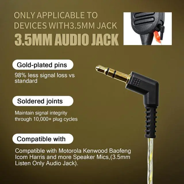 With reinforced cable stress relief and a secure-fit ear wing, it stays firmly in place during running, climbing, and rigorous activities. ^^ [Universal Connection]Instantly connect. Compatible with most radios, speaker microphones, and walkie talkie PTTs featuring a universal standard 3.5 mm jack.