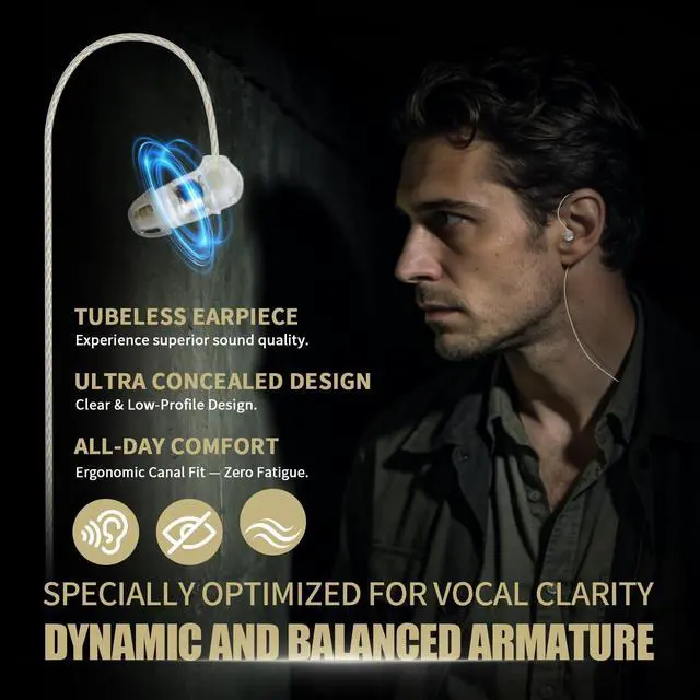 [Covert Durable Design]Built for demanding, all day covert missions. The tubeless construction prevents moisture and discoloration, while low profile, noise isolating ear tips ensure maximum concealment and durability. ^^ [Engineered for Comfort Awareness] Achieve all day comfort and vigilance. The ergonomic fit prevents ear fatigue, and the open design maintains awareness of your surroundings for safety. ^^ [Critical Audio]Never miss vital communication. The premium balanced armature speaker delivers high-definition audio directly to your ear canal, eliminating the need for max radio volume. ^^ [Active Duty Secure Fit]Designed for dynamic movement.
