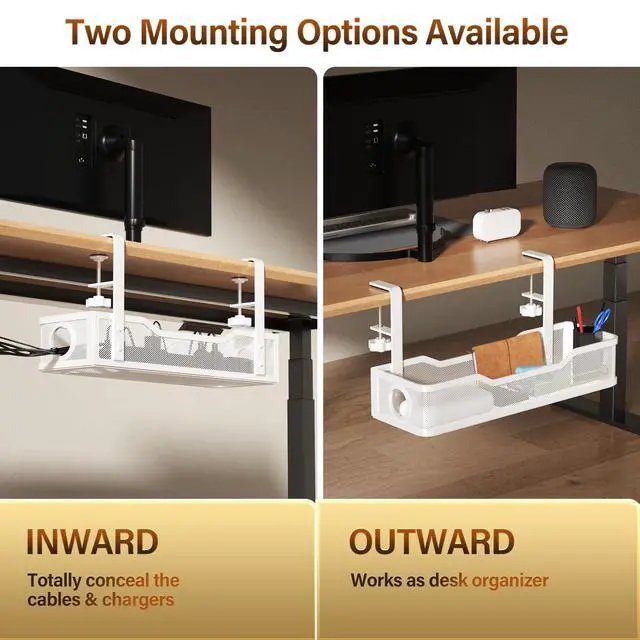 ^^ No Need to Drill Holes - Instead of damaging your desk, our under desk cable management tray can be hung directly onto desk frames and adjust the position as easily as you like, unlike other screw installations. The wire management, following thorough welding and powder coating, offers resistance to rust and dust accumulation, ensuring dependable long-term use under the desk. ^^ Save Storage Space - No more mess. No more hanging or tangled wires. Experience complete wire management under desk. Organizes all data cables, power cords, computer transformers, and outlet strips off the floor.