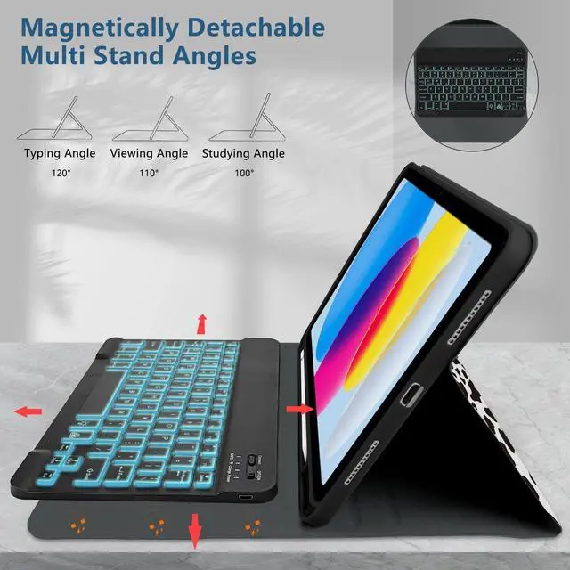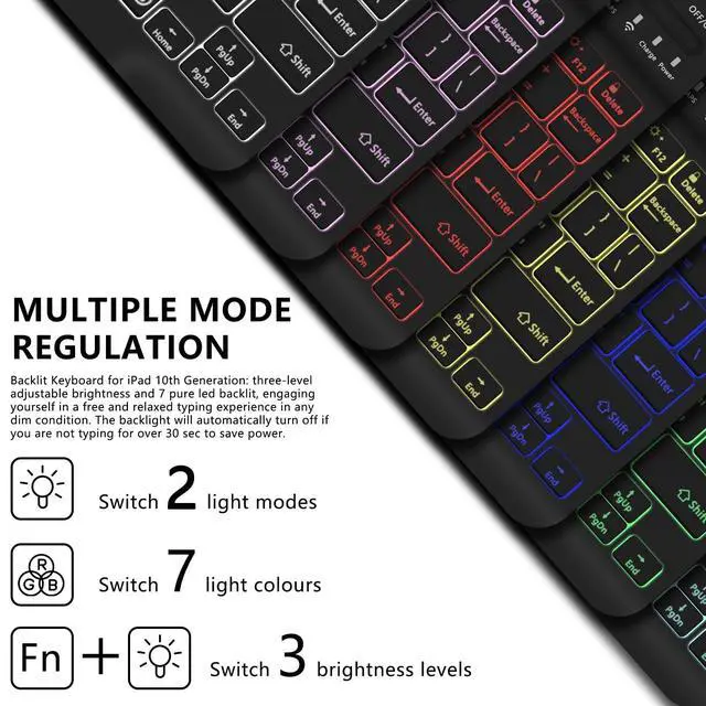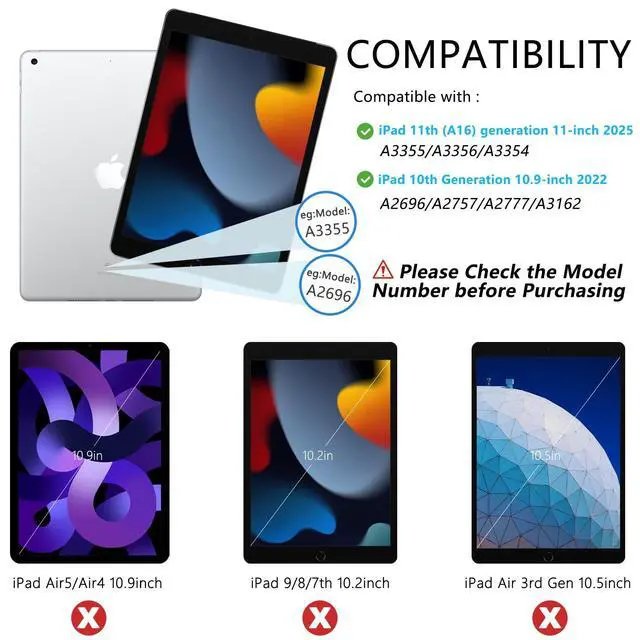 Generation (Model Number: A2696/A2757/A2777). for iPad 11th (A16) generation 11-inch 2025 (ModelA3354, A3355, A3356), Please check the model number on the back of your for iPad before purchasing ^^ [LED Backlit Keyboard] 2 light modes (Monochromatic and gradient light), three-level adjustable brightness and 7 pure led backlit, engaging yourself in a free and relaxed typing experience in any dim condition. The backlight will automatically turn off if you are not typing for over 30 sec to save power. ^^ [Rechargeable Keyboard] The for iPad Bluetooth keyboard has a built-in battery with high stability, so you don't need to replace the battery. You can charge the keyboard using the charging cable that comes with the keyboard. The keyboard has a Bluetooth acceptance range of 10 meters. If you don't need to use the keyboard, you can remove it and turn it into a regular for iPad case, which makes for a handy experience. ^^ [Automatic Sleep/Wake] This for iPad case will automatically put your for iPad to sleep when you close the front cover of the case. Because an iron keyboard may prevent magnets from attracting to each other, remove the keyboard for optimal sleep/wake up.