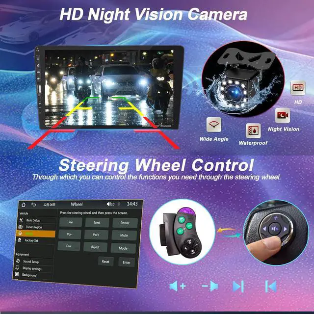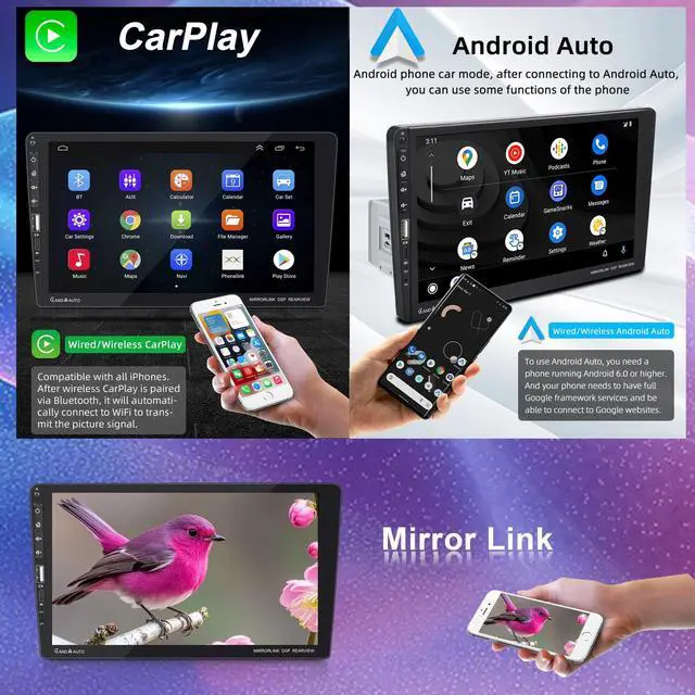 Wireless & Wired Apple CarPlay / Android Auto Seamlessly connect your iPhone or Android smartphone for hands-free calls, GPS navigation, music, and messaging. ^^ 9 HD IPS Touchscreen Large 1024x600 display with responsive G+G capacitive touch for clear, smooth, and easy operation while driving. ^^ Bluetooth 5.2 Technology Enjoy faster, more stable connections for wireless music streaming, hands-free calling, and phonebook sync. ^^ Universal Single DIN Fit (188x58mm) Standard installation size with slim body and 9-inch floating screen, compatible with most vehicles. ^^ HD Night Vision Backup Camera Included Waterproof 12-LED rearview camera provides wide-angle, clear reversing images for safer parking.