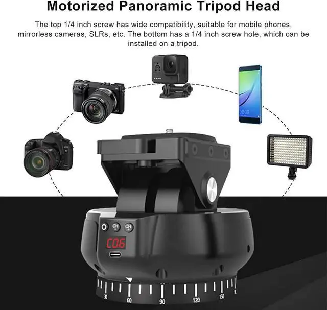 WIDE RANGE OF FUNCTIONS: With 3.5 mm shutter release interface, support AB point positioning shooting, time lapse shooting, intelligent automatic shooting mode, panoramic shooting. ^^ PHONE CLIP AND TPYE C CHARGING: Equipped with a mobile phone clip, the clamping range is 69.5 cm, and it supports horizontal and vertical shooting, 360 rotation shooting. Tpye C charging interface, built in 2000mah large capacity rechargeable battery. With a maximum load of 1Kg.