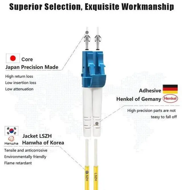 • High Rated OS2 9/125m Fiber and Cladding, which is Insensitive to bending,Easy peeling,Easy welding,ensures small optical loss and stable transmission. The core is Japan imports zirconia powder ceramics, which is High Return Loss,Low Insertion Loss,Low Attenuation feautures.
