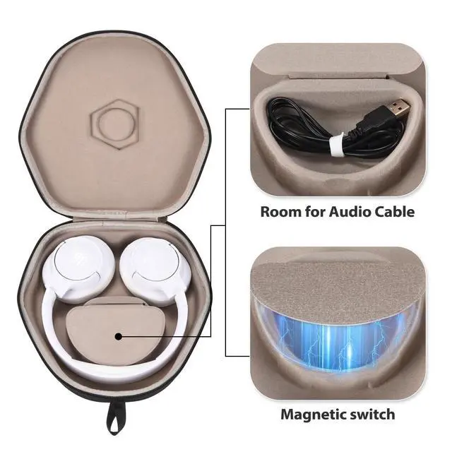 Thoughtful Design : This over-ear headphone storage case comes with a built-in data cable box. The lid has a magnetic attraction function, allowing it to hold both gaming headphones and other accessories at the same time. It can be opened up to 180 and has a 340 zipper design. The internal magnetic attraction design also enables the storage of other accessories. Additionally, we have thoughtfully placed two rubber bands for your convenient data cable storage
