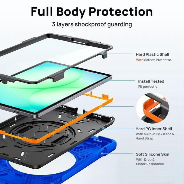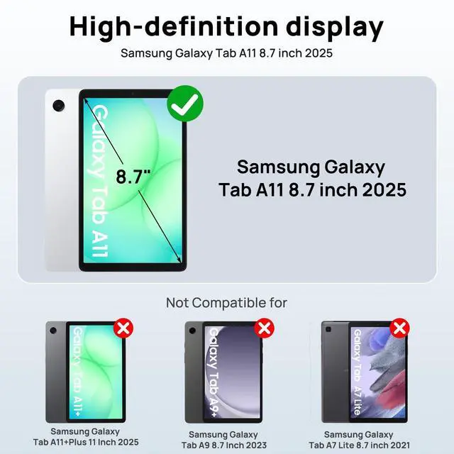 Compatible ModelsCase for Samsung Galaxy Tab A11 8.7" 2025, (Model: SM-X133/X135/X135F) please check your model number before purchasing. ^^ Full-Body ProtectionCase for Galaxy Tablet A11 is designed with a triple-layer reinforced structure, the soft silicone outer layer combined with sturdy PC material and built-in screen protector protects your tablet. Whether you are traveling outdoors, working in business, or playing with your kids, all can be handled with ease ^^ 360 Rotatable Stand and HandleThe 360 rotatable stand is newly upgraded to bring you the ultimate using experience. The specially designed Handle on the back is not only easy to pick up and place, but also frees up your hands, making it easier to use ^^ Mechanical Button for Instant DeploymentCase for Galaxy Tab A11 8.7 inch with mechanical button for 1-Second stand deployment/retraction. A dust cover is specially equipped at the hole, effectively preventing the intrusion of dust and water droplets, ensuring that your device interface is always clean and safe. ^^ Adjustable Shoulder Strap & Built-in Pencil HolderFor Samsung Galaxy Tab A11 8.7 inch Armor Case Easy to hang the tablet with a shoulder strap, convenient for outdoor, travel, and family use.