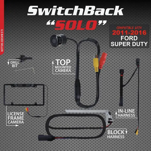 You Need]: Rearview Camera Setup includes; license tag frame with camera/lights, drill in camera, switchback in-line harness, SOLO block, wire ties, and instructions